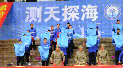 身着迷彩,战意十足;红绸飞舞,鼓声阵阵。红蓝旗帜交错飞扬,拍手器烘托热情氛围,蓝色花球与海天衣衫交相辉映,传递海天健儿的热血信念。