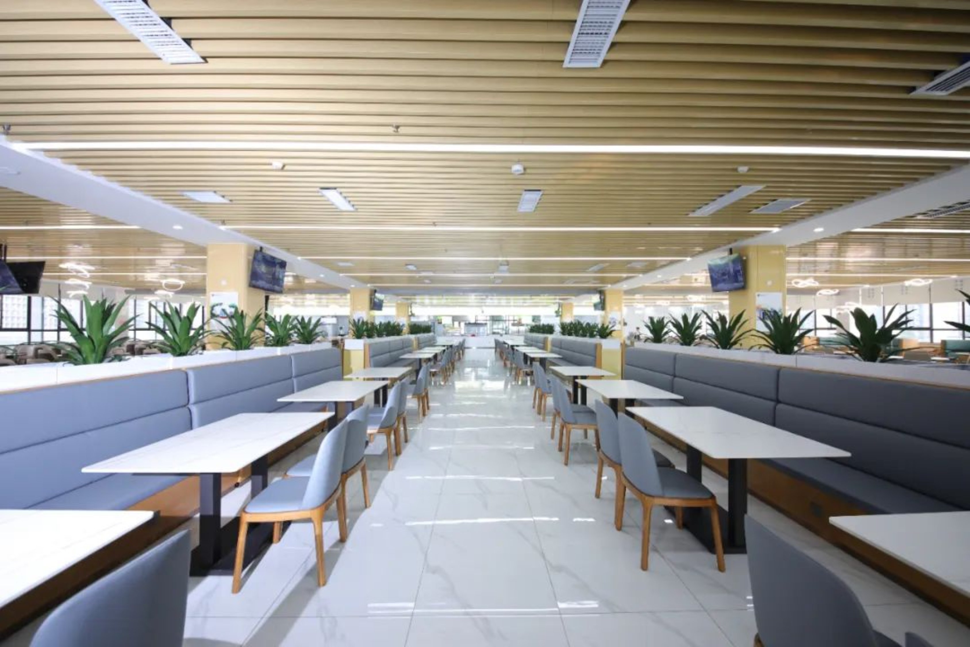 广阔宽敞的就餐区域清新明亮的装修风格简约舒适的桌椅设计集官兵用餐、社交分享精致生活于一体解锁用餐新体验