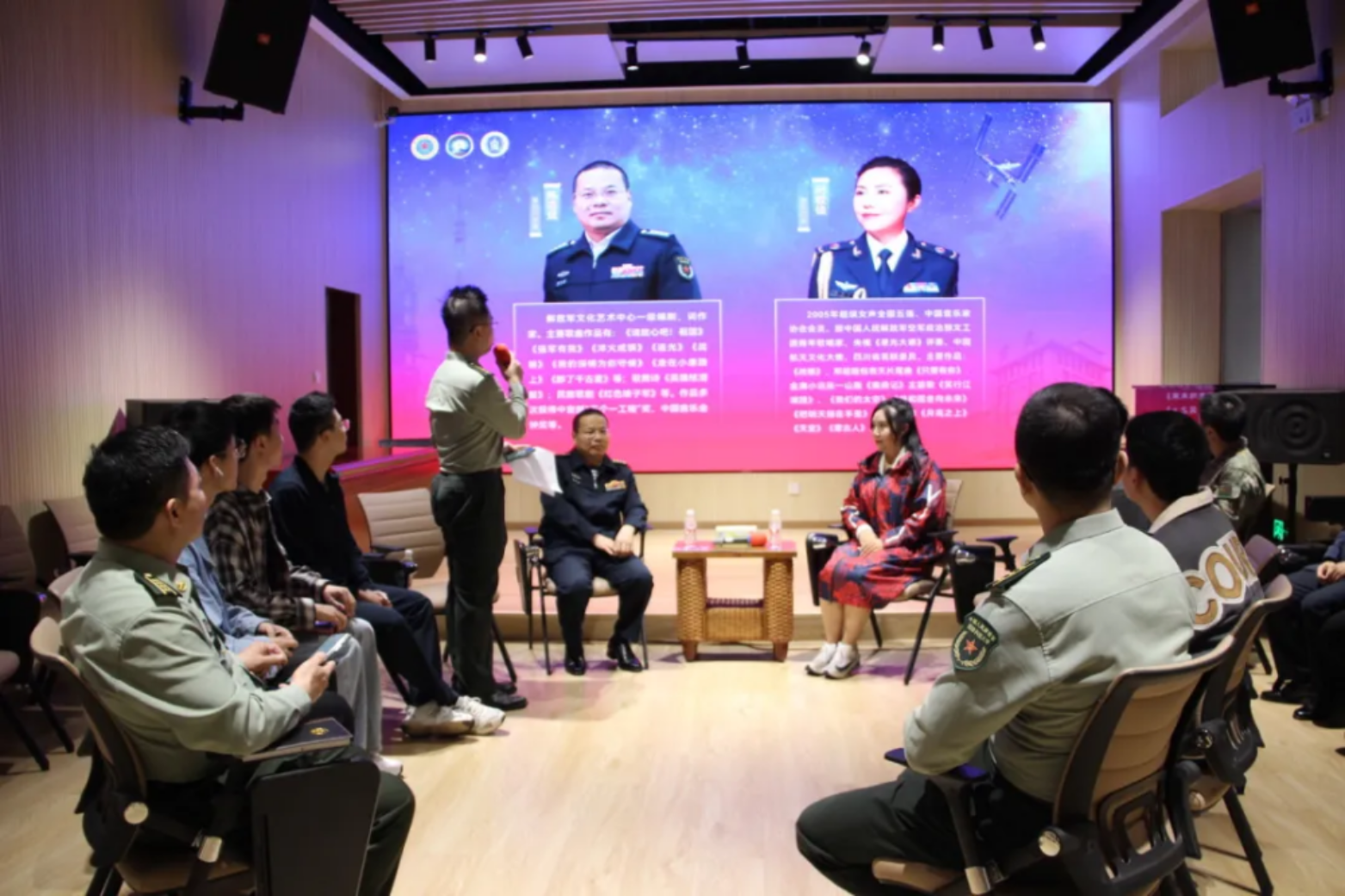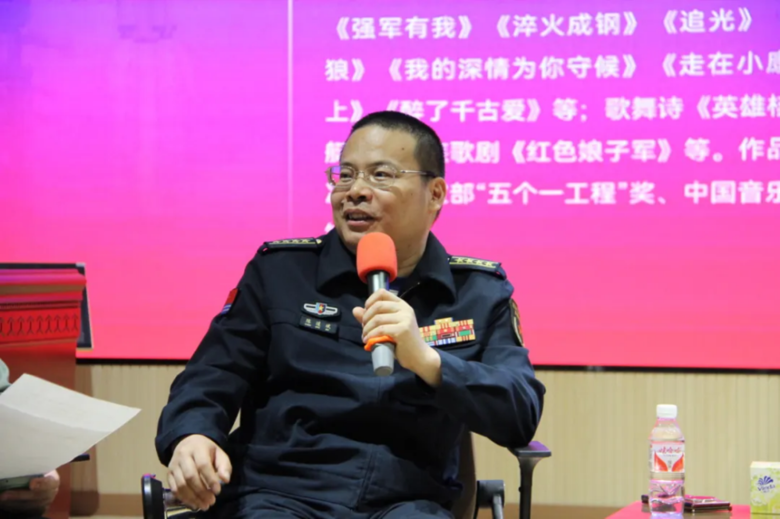 在一号院高地会堂,军旅词作家陈道斌、著名歌手纪敏佳就音乐创作问题和学校“高地”音乐创作室和“炽热”电声乐俱乐部的师生展开了探讨。