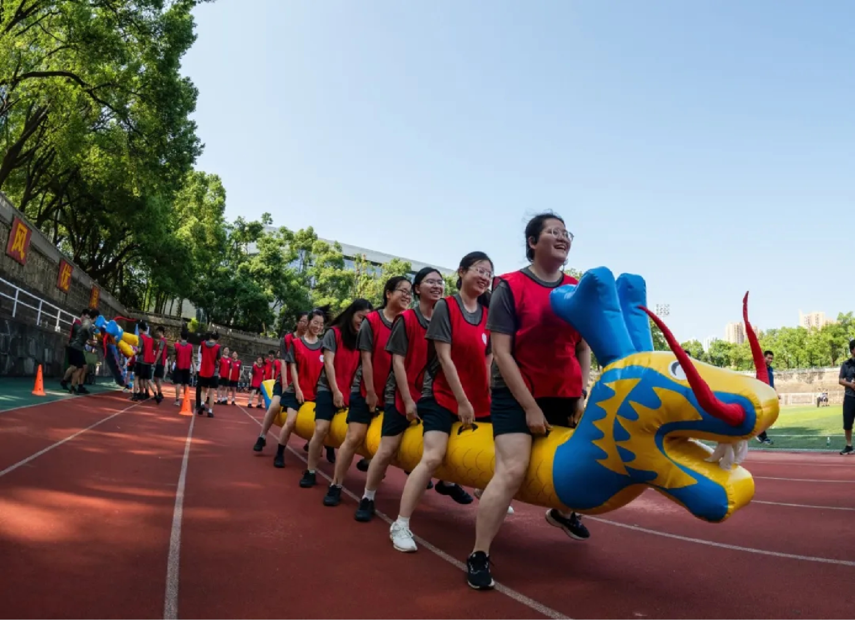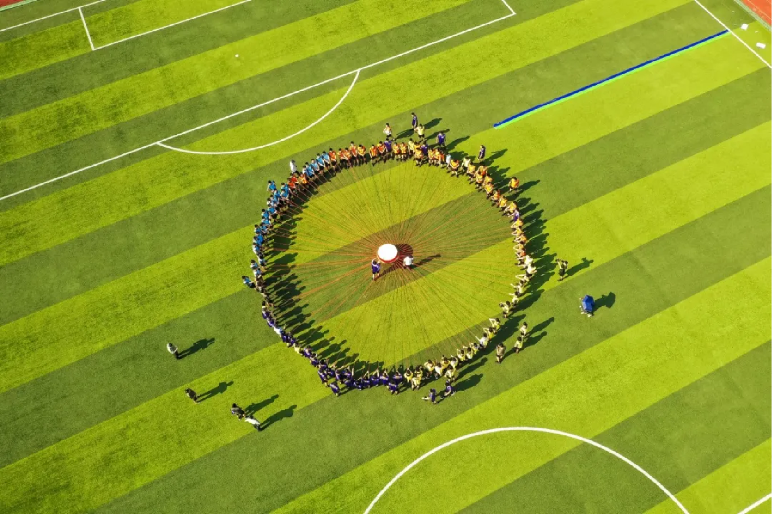 “百人战鼓”环节中,同学们通力合作,拉动大鼓的长把手,齐心协力地颠起皮球,将活动气氛推向高潮。
