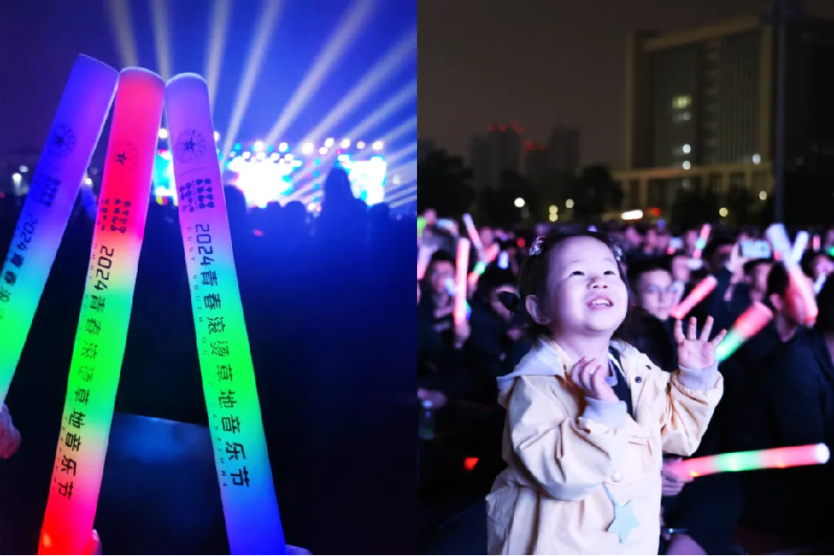 此次音乐节,特别邀请到军旅歌唱家小曾老师,他先后演唱了快炙人口的《我的老班长》《当你的秀发拂过我的钢枪》《军中绿花》《若有战,召必回》等歌曲,旋律在万千光芒中化为诗歌,潺潺流动,向远方。现场观众也用荧光棒划出光痕,同小曾老师合唱。