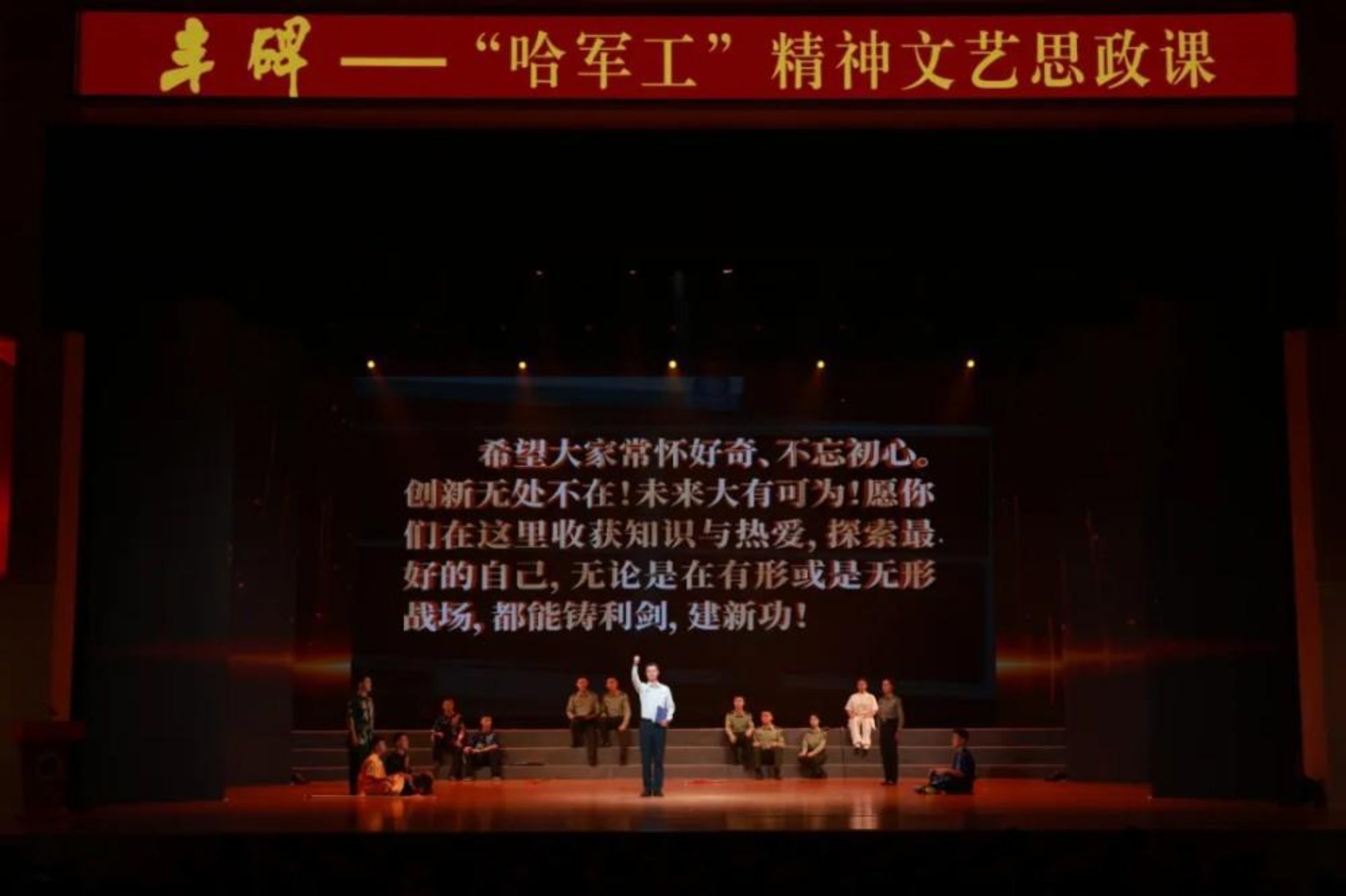 与传统思政课多以老师在课堂的理论讲授为主不同,这场文艺思政课在舞台上下同步开展。学员从“听”课变成“创”课、“演”课。在大家共研共练共演中,对“哈军工”精神有了更深的理解和更好的传承!未来,我们会持续优化课程,探索思政教育新模式,更好地助力学员们的成长和进步!