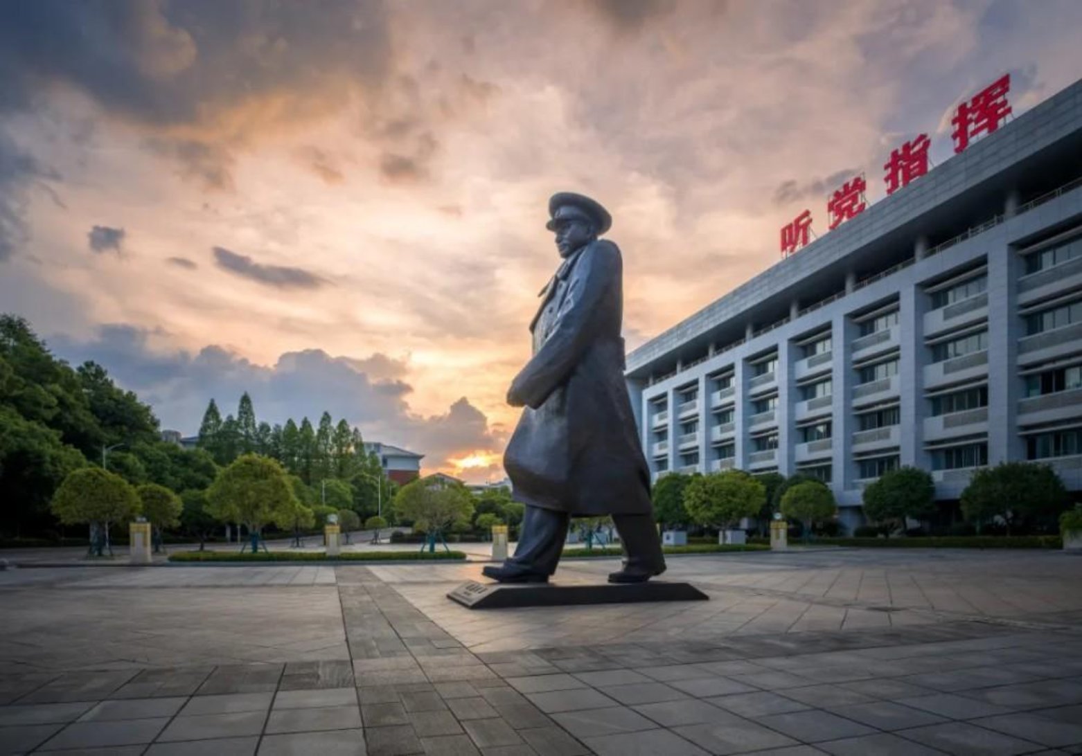 晚霞为天际铺展成温柔的橘红,陈赓大将雕像静立广场中央,身姿挺拔如当年,目光望向远方。绿树环绕间,雕像似在轻声诉说,从松花江畔到湘江之滨,国防科技事业的薪火,正在此代代相传。