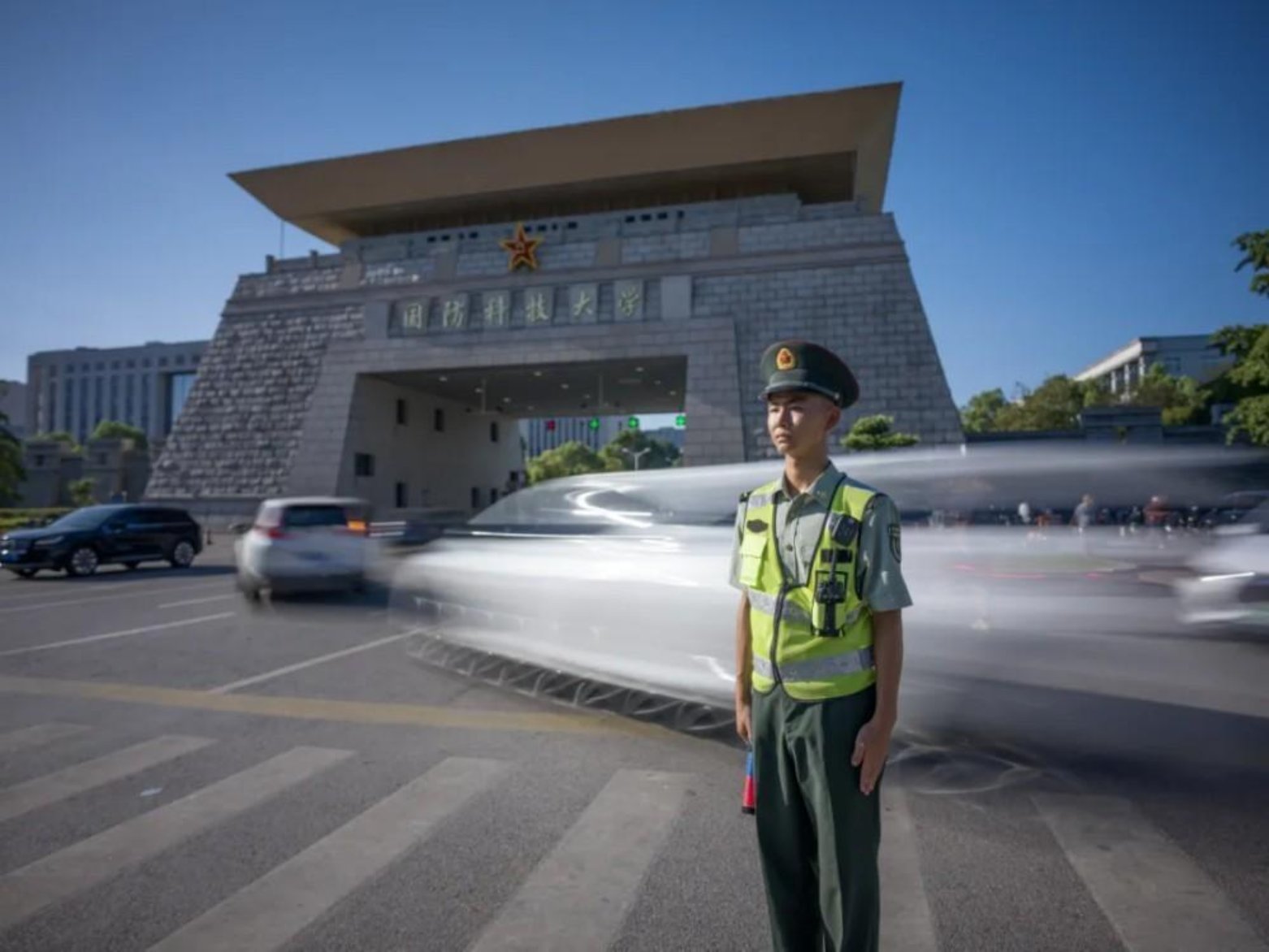 科技大楼矗立在蓝天之下,其旁的导弹雕塑气势恢宏,底座的浮雕诉说着国防科研的历程。这里汇聚学校多个重点实验室,年轻的学子在此挑灯夜战破解难题。一位学生骑车驶过,在科研与青春的交汇点,彰显着对国防科技探索的蓬勃朝气。