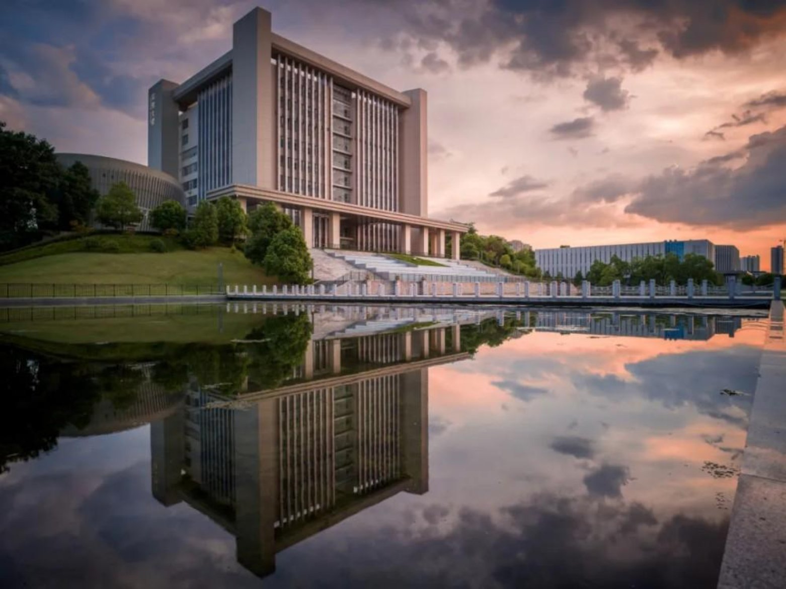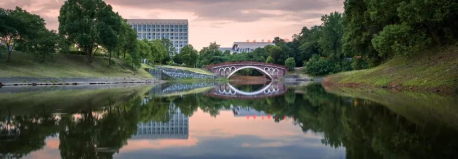 晚霞轻染天际,小湖如镜,将三号院里的小桥、培训大楼与高地文体馆的身影温柔收纳。红桥拱立,似长虹卧波;培训大楼与高地文体馆在绿意间错落,标语熠熠生辉。四周绿树环绕,这般景致,让校园的黄昏满是宁静与朝气。