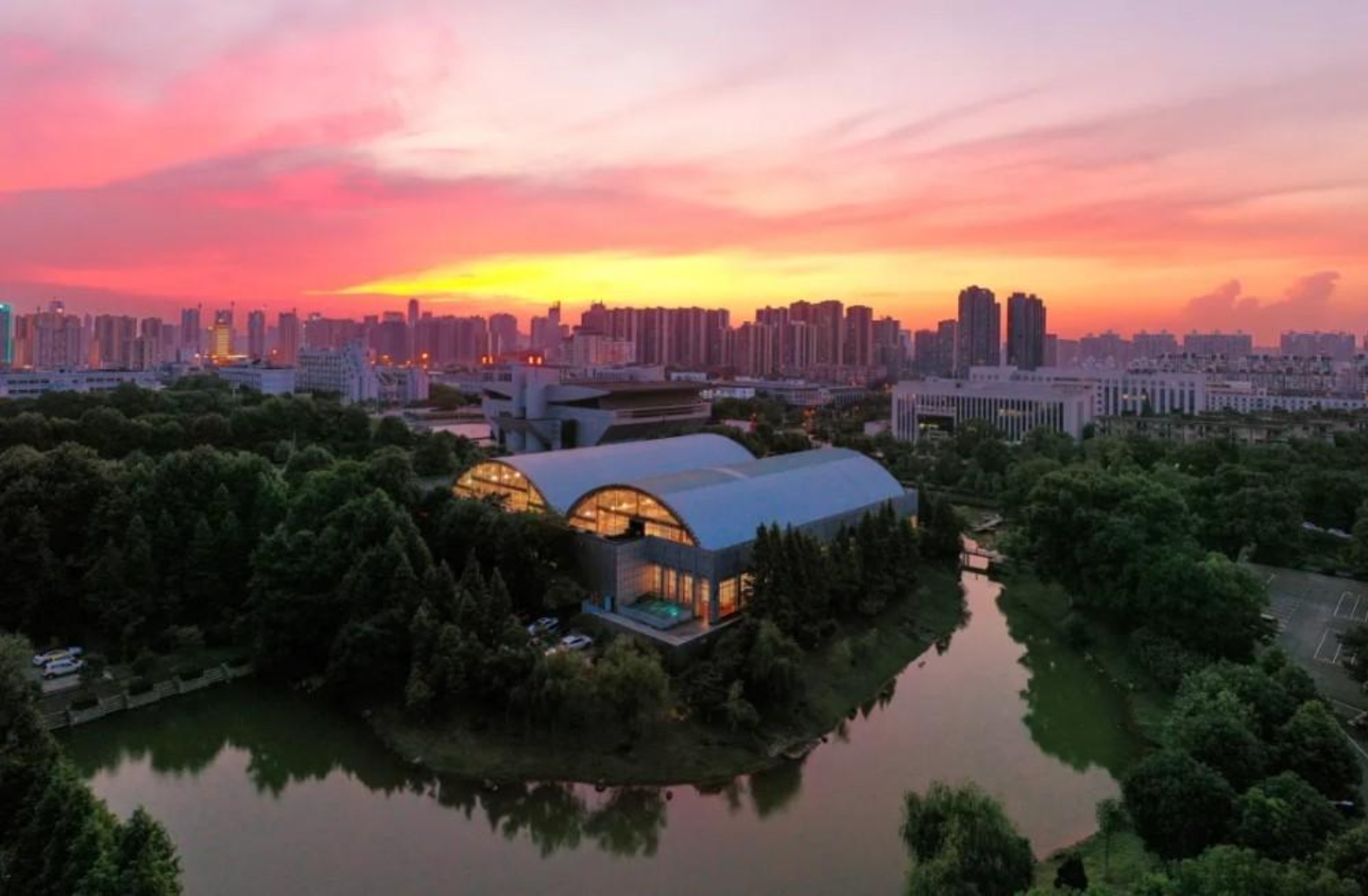 夕阳西下,学校的游泳馆被绚烂的晚霞温柔环抱。银灰色的建筑在霞光里泛着清波,馆内灯火璀璨。旁边的小湖如一块翡翠,倒映着游泳馆、绿树与漫天晚霞,与远处的城市建筑相映成趣,构成了一幅静谧而绝美的校园风景。