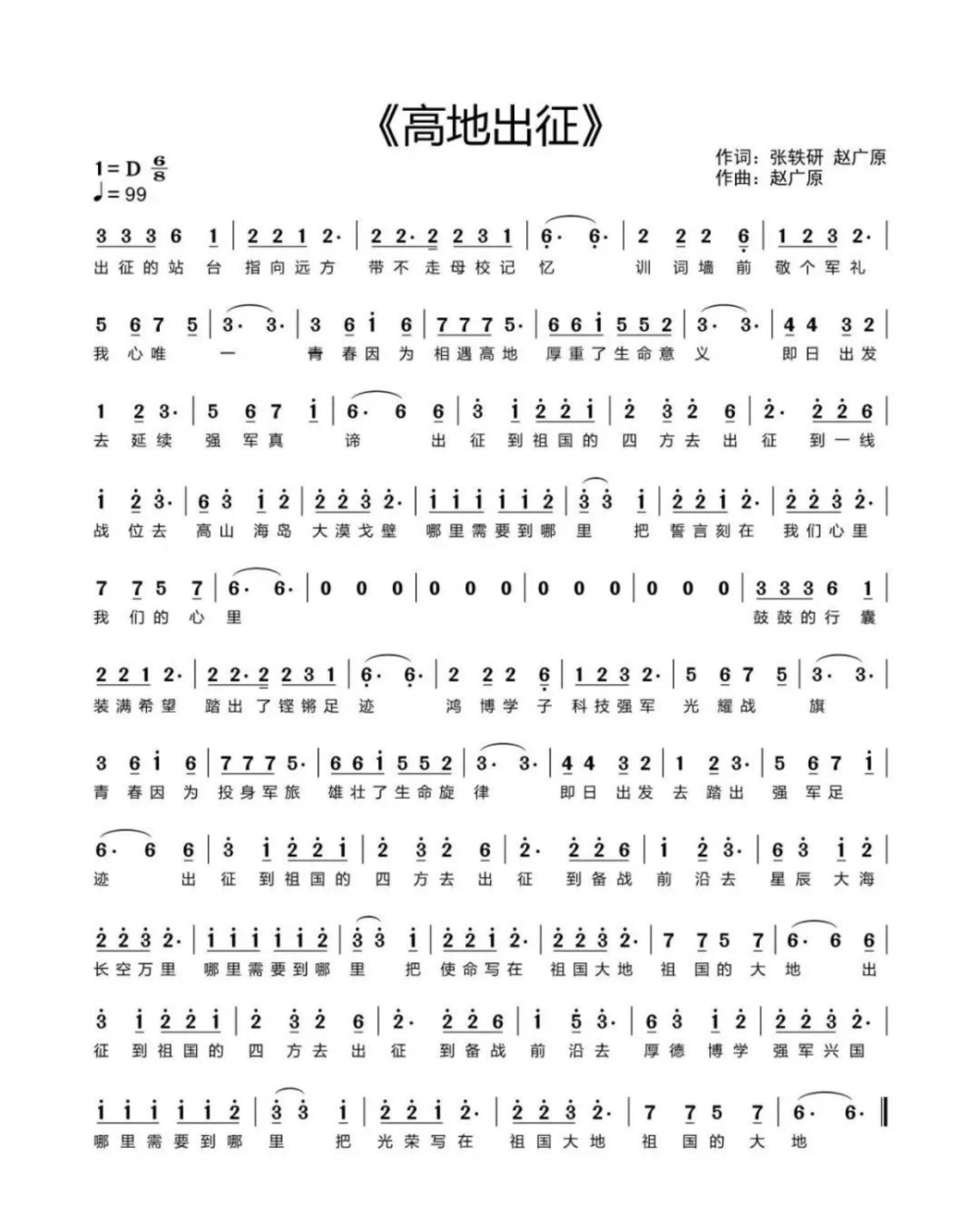 继毕业歌曲《高地启航》之后,学校又推出原创歌曲《高地出征》,不同的旋律,相同的志向,热血激荡着青春豪情,高地之上,一颗颗跳动的心脏在这一刻充满无穷力量,正如歌词所唱“哪里需要到哪里,把使命写在祖国大地...