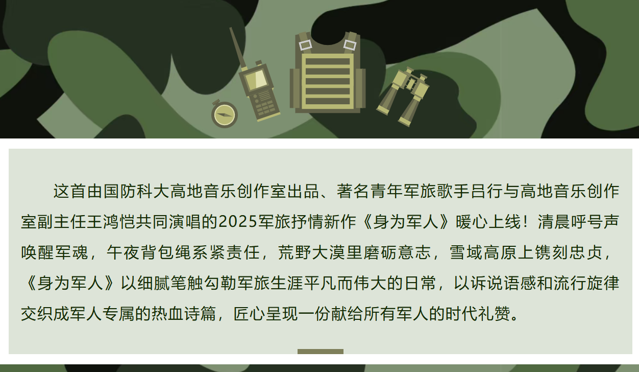 这首由国防科大高地音乐创作室出品、著名青年军旅歌手吕行与高地音乐创作室副主任王鸿恺共同演唱的2025军旅抒情新作《身为军人》暖心上线!